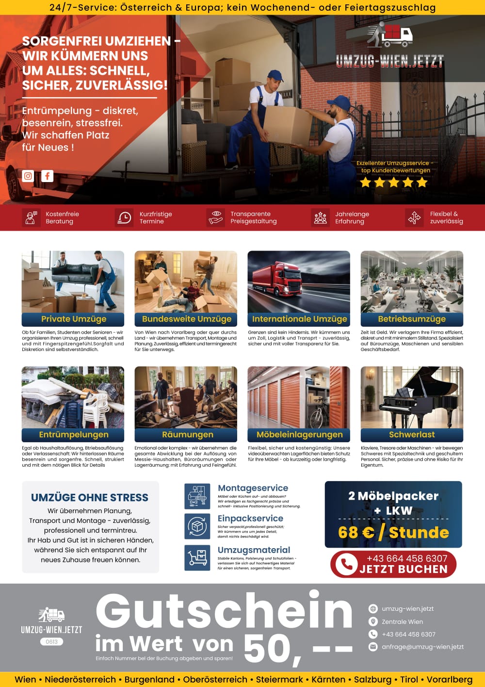 Planen Sie Ihren Umzug in Wien? Kontaktieren Sie uns für eine professionelle und stressfreie Übersiedlung. Unser erfahrenes Team unterstützt Sie bei Ihrem Privatumzug, Firmenumzug oder Spezialtransport. Fordern Sie jetzt eine unverbindliche Beratung für Ihren reibungslosen Start ins neue Zuhause an.